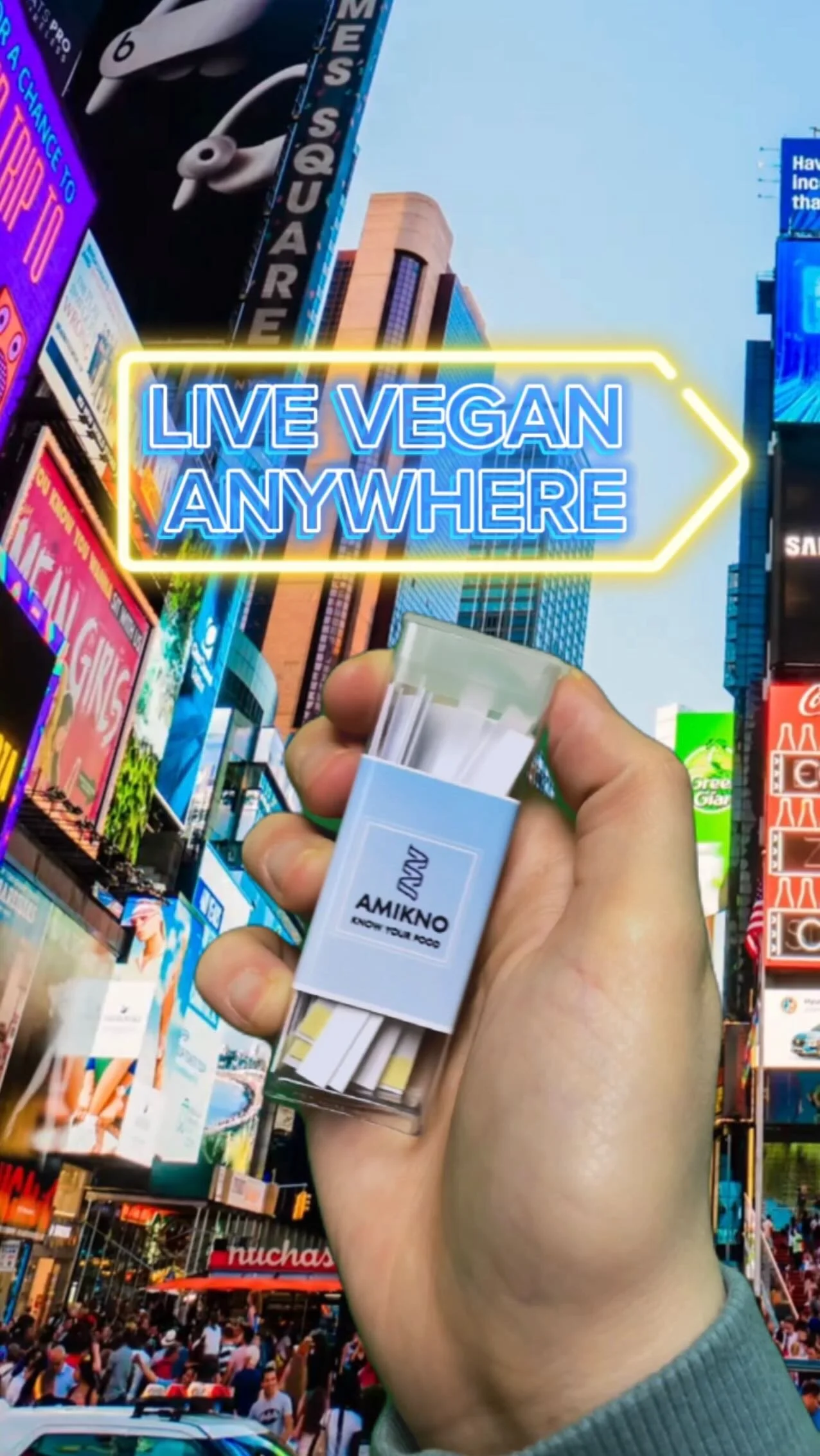 The test involves placing an Amikno strip against the surface of your food, beverage, or product - (lotion,body wash, shampoo). The swab contains a piece of plant-based litmus paper that changes color to indicate the presence of dairy, meat or animal by-products.